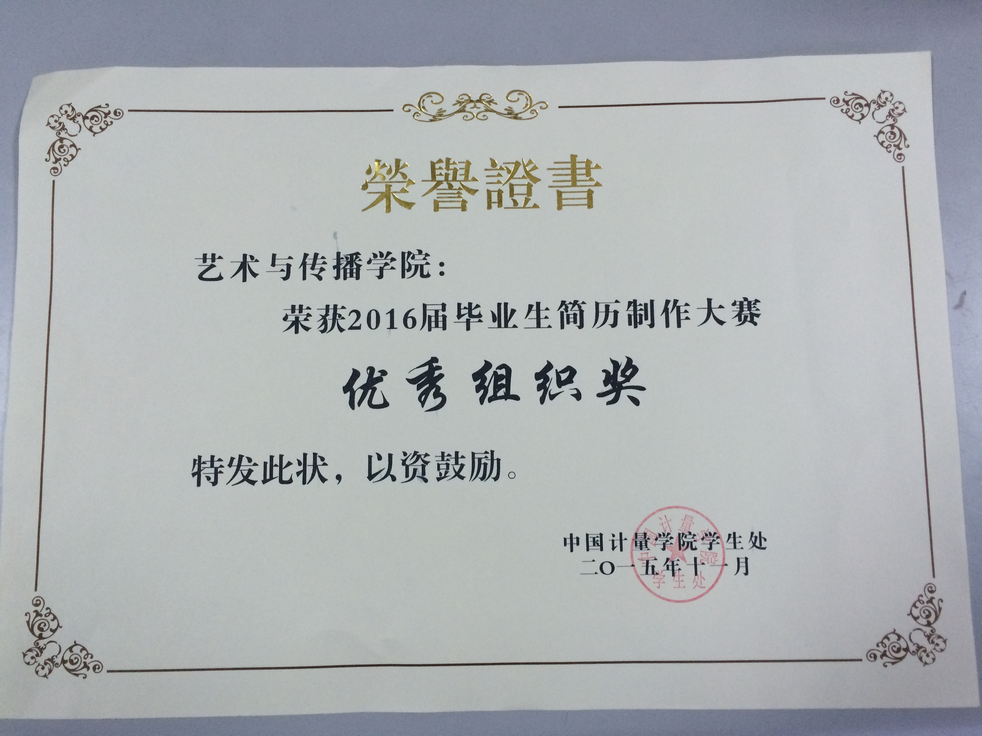 在前不久我校开展的2016届毕业生简历制作大赛中,我院同学表现出众,共有十位同学得奖,艺传学院更是被评为2016届毕业生简历制作大赛优秀组织。