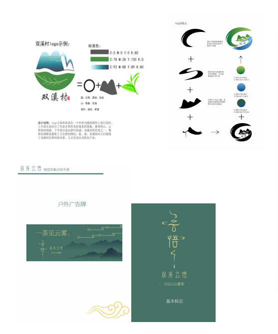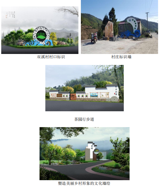 例如,教工第二、三支部党日活动中,肖丹、吴烨等支部书记与入党重点发展对象谢伟老师多次商讨了具体村容改造方案,围绕绿色、文明的乡村形象主题,规划了村口标识、茶园游步道和观景亭以及大学纪念林等系列景观设计方案,并组织带领学生等为双溪村设计了logo、整体视觉识别形象以及凸显当地文化特色的墙绘工程。同时,还注重融入思政育人的内容,在此建立了校外大学生社会实践基地,以吸引广大党员师生更持久地参与到美丽农村建设中,进一步提升“两学一做”的长效性和制度化水平。(见下图)