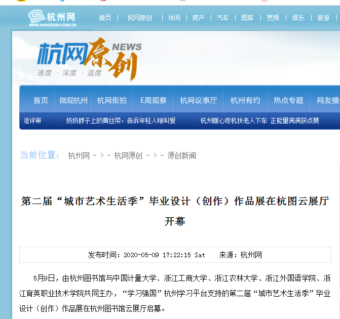 5月9日学习强国、杭州网、钱江晚报小时新闻等各大媒体平台纷纷推送了一组在杭五大高校联合举办线上毕业设计作品展的新闻。我校艺术与传播学院组织参与的第二届“城市艺术生活季”毕业设计作品展将于5月25日正式在杭州图书馆云展厅启幕。