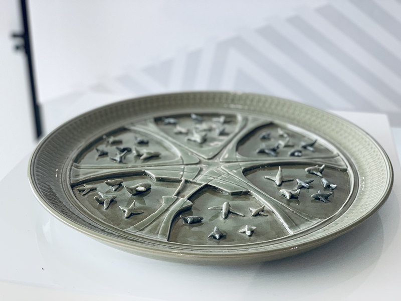“越窑大兴机场青瓷大盘”作品:则以北京大兴国际机场为原型,内外施釉,釉色青绿,光亮均净,器型规整,反映出东方大国源远流长的文化底蕴和开放包容的磅礴气度。
