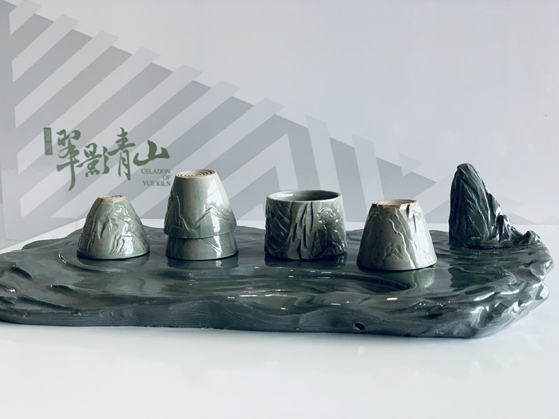 “源青盘”作品:取材于“绿水青山就是金山银山”的发展理念,以绿水青山为原型雕刻出茶盘和茶杯,表达出对生态文明建设的美好愿望