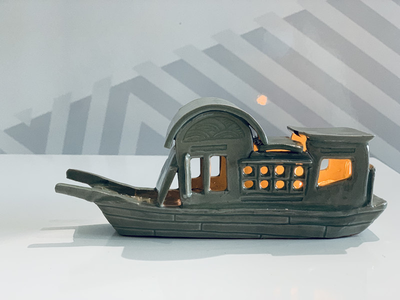 “红船香烛”作品:通过提炼红船的几何线条、简化其造型、在船内加入蜡烛的方式,重现了百年前革命先辈在南湖红船上开会时的场景