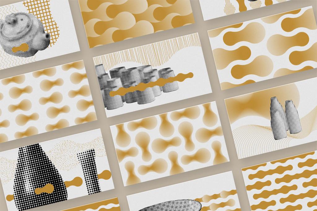 设计理念:以一个较为简洁流畅的器物形状作为logo的基础部分,根据金缮修复作品的共性,提取金属部分作为主体元素,赋予一个固定的形态。以多个圆合并相切得到一个小波浪形的图形元素,表现出“流金”的感觉,并在此基础上用不同形状的图形排列方式表现不同的纹理。对金缮修复中“修复”的部分赋予含义,加强博物馆形象辨识度,给人印象深刻。