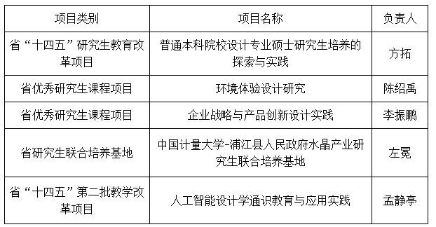 四、研究生教育改革情况 1、人才培养 本学位授权点以提升研究生教育质量为核心,严格质量管理,引导研究生教育高质量发展。根据《中国计量大学研究生培养工作规定(中量大〔2023〕58号)》《中国计量大学硕士研究生学位论文工作管理规定(中量大研生〔2022〕9号)》等文件精神,对学位论文选题、开题报告、中期检查、预答辩、机检盲审、毕业答辩各个环节严格把关,开题报告和中期检查实行开题报告实行末位不通过制度,有15%的学生须进行二次答辩;预答辩或盲审成绩不合格者,学位论文须进行不少于3个月的修改。 为培养应用型、复合型的高级艺术设计和设计管理人才,本领域建有中国计量大学温岭工业设计创新研究中心、中国计量大学平阳工业设计研究院、中国计量大学工业设计创新研究中心等科研基地,拥有中国计量大学科技创新团队,在杭州、金华、温州等地建设了七个区域性的产学研合作平台,全面接入“三强一制造”、服务区域经济转型升级和当地的美丽乡村、特色小镇建设。在前期学院与浦江水晶产业研究院签订联合培养协议的基础上,2024年成功获批1个省级研究生联合培养基地。通过制定“订单式”专业实习实践计划,结合实际项目设定研究生毕业论文课题研究内容,突出对研究生实践能力、创新能力的培养,实行图书资料、仪器设备、科研资源的共享,充分发挥高校和企业各自优势,构建新型高层次创新人才培养模式。 截止2024年12月底,本学位点承担的省级以上教学改革与课程建设项目详见表2。 表2 学位授权点在研、在建的省级以上项目